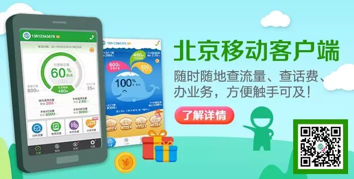 查流量、查话费、办业务,更多优惠咨询就在北京移动客户端。