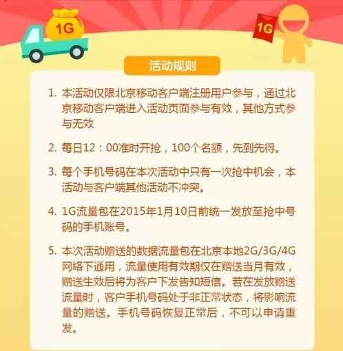 第二步:登录北京移动客户端,进入“发现”栏目,“疯抢1G流量”活动位于页面首位,点击即进入活动页面。记得一定要在中午12点之前就进入活动页面等待“吉时”到来。