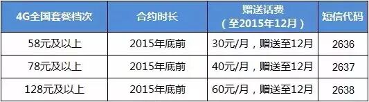 如果您上月套餐为非4G套餐(一毛卡、神州行、动感地带等套餐),那么恭喜您,您是我们的幸运客户,现在可下载掌上营业厅升级为相应档次的套餐,如78元全国版套餐,并在当天发送短信“2637”到10086参与该活动,2015年12月份之前每月返还40元话费,相当于消费38元可使用78元套餐,是不是很划算呢?赶快去办理吧,参与越早越好哦~~~