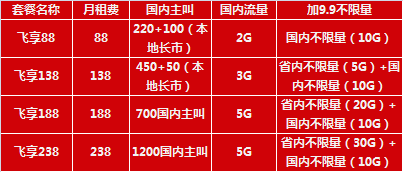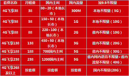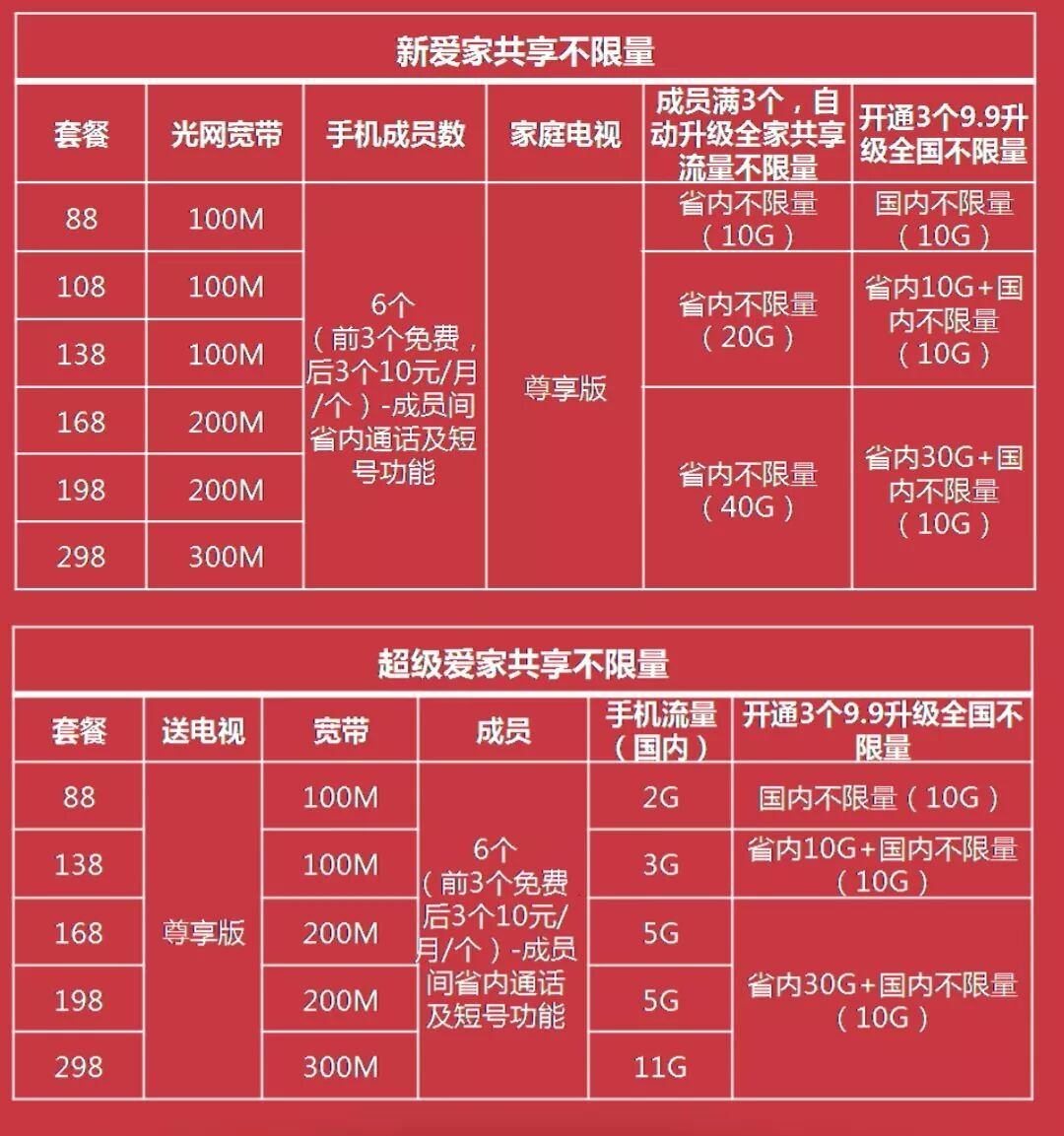 A.普通用户 B.集团用户尊享 1.加1元功能费,即享100M宽带、尊享版电视免费用,送光猫,送机顶盒。 2.新入网飞享38及以上套餐,开通9.9即享全国流量不限量。 3.政企集团老客户有国内漫游需求的,可订购9.9元全国不限量(限时包),有效期为1个自然月。 4.办理新爱家88及以上宽带(家里3人合账消费88元/月及以上),享全省流量不限量,开通3个9.9自动升级为全国不限量。 5.不限量客户流量超出阀值限速后,可以叠加15元流量加速包,本地加速包15元5G、省内加速包15元3G、全国加速包15元1G。