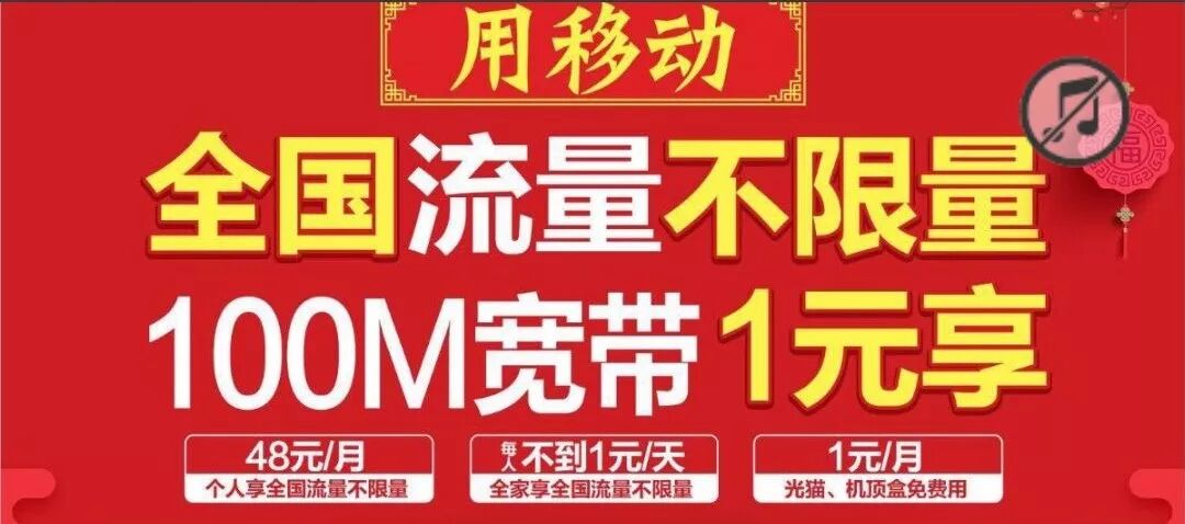 100M宽带1元/月丨全家享全国流量不限量不到1元/天 通信消费不限量时代脚步渐进 为响应国家提速降费的号召 资阳移动已推出48元全国流量不限量 同时推出9.9元7天全国流量不限量叠加包 家庭共享全国流量不限量(以一个六口之家为例,每人每天只需0.82元,即可享受全家共享全国流量不限流量)
